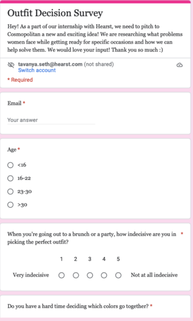 To find out what challenges our target audience face while deciding their outfit, I created a survey and shared it within the organisation.
